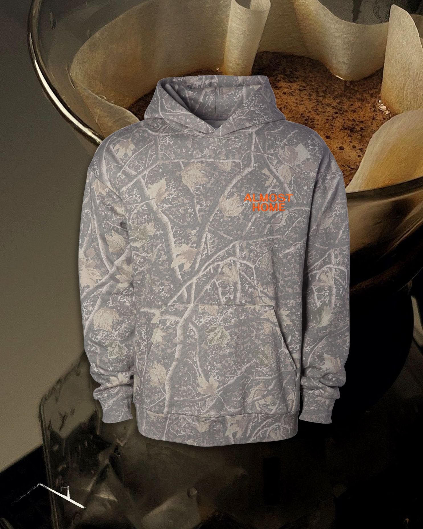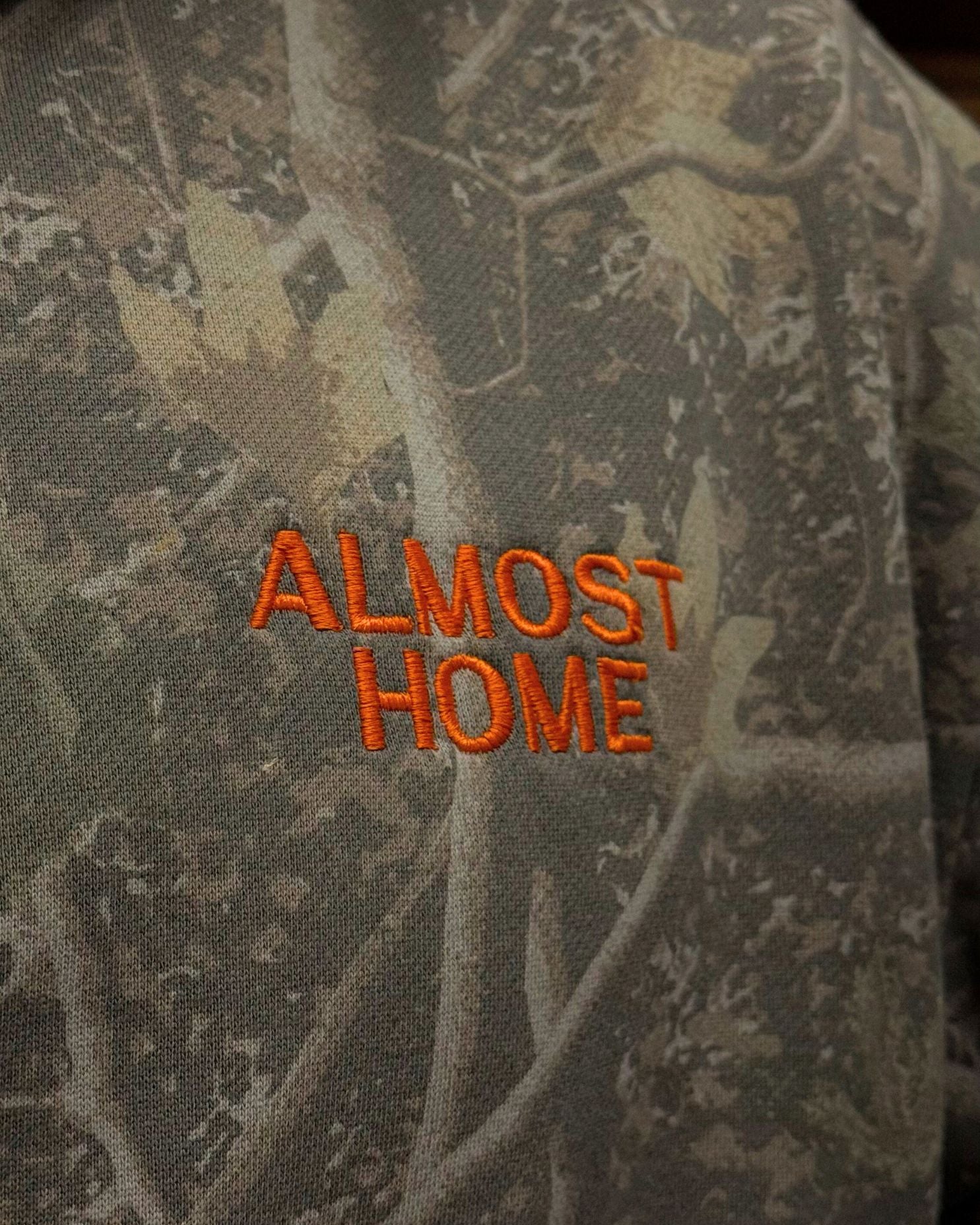 Orange "Almost Home" left chest embroidery on a camo heavyweight pullover. Made from 10oz. fleece, weighing in at a robust 330gsm. Featuring an oversized fit, drop shoulder, and no drawcord.