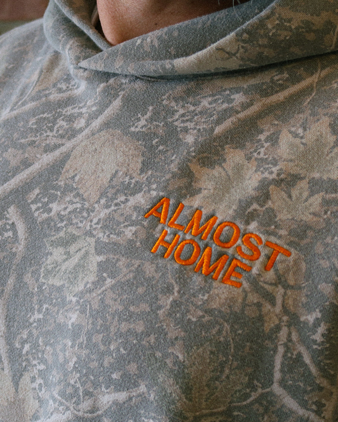 Orange "Almost Home" left chest embroidery on a camo heavyweight pullover. Made from 10oz. fleece, weighing in at a robust 330gsm. Featuring an oversized fit, drop shoulder, and no drawcord.